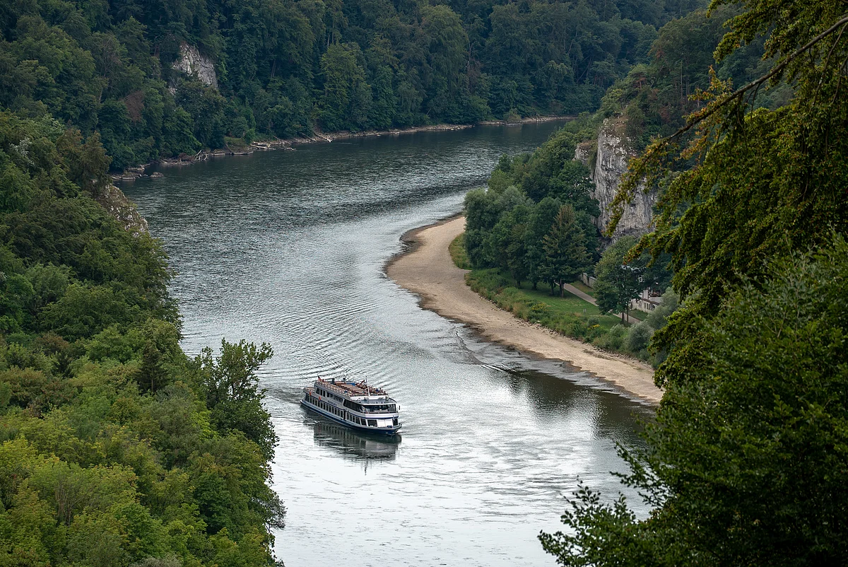 10 km später erreichten wir das malerisch gelegene Kloster Weltenburg. Es liegt oberhalb des Donaudurchbruchs in einer Donau-Schlinge. Nach dem Morgenprogramm mussten wir uns erst einmal im Biergarten stärken. Da der Radweg an dieser Stelle die Donau verlässt und man keinen Einblick auf den Donaudurchbruch bekommt, beschlossen wir für ein paar Kilometer eine Zille (sehr flaches Boot) zu nehmen. Der Durchbruch ist eine Engstelle des Donautals und zu beiden Seiten ragen steile Felswände in die Höhe.