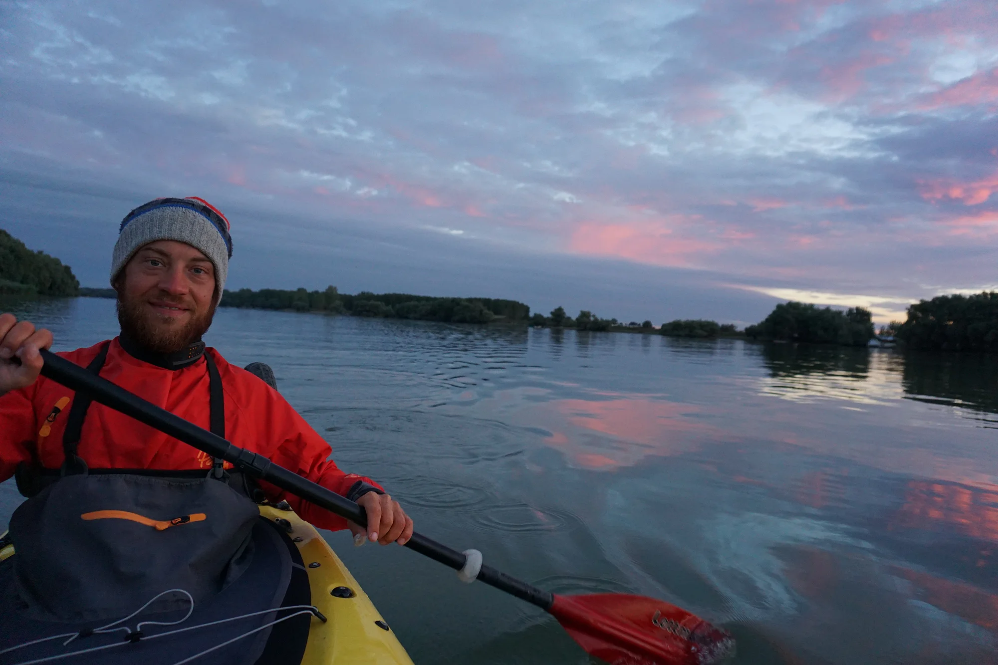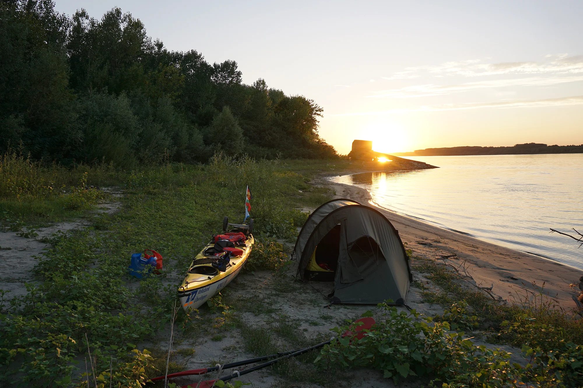 Dass an diesem Tag drei heftige Gewitter auf uns warten würden war morgens beim Start in Bratislava noch nicht zu erahnen. Nachmittags ging es dann los. Schwarze Wolken, Regen, Blitz und Donner. Jede Gewitterfront bedeutet für uns ab ans Ufer, raus aus dem Wasser und unterstehen bis das Gewitter über uns hinweg gezogen ist. Nach so viel warten und paddeln im Regen, freut man sich sehr über einen trockenen u. warmen Schlafsack im Zelt.