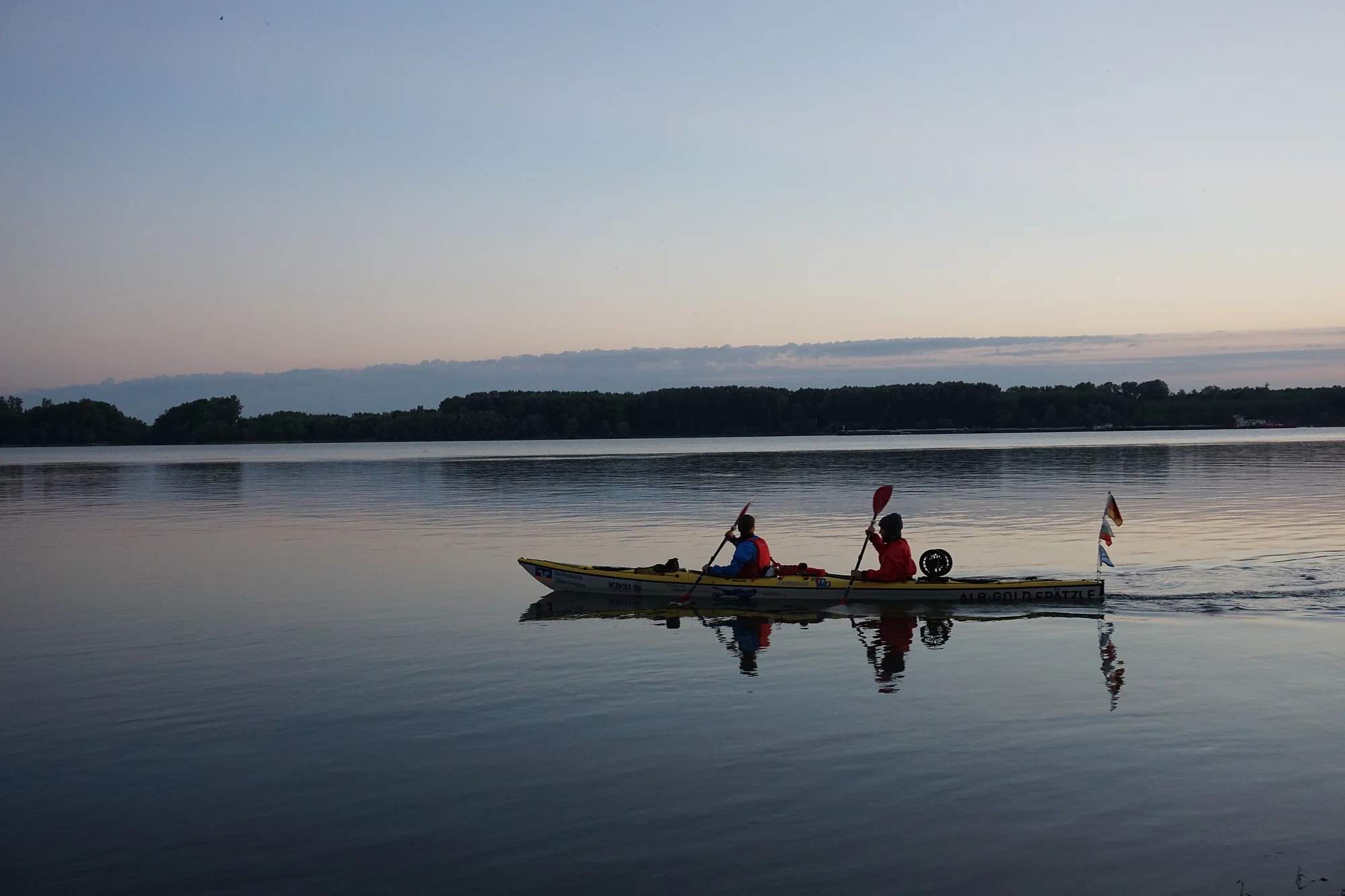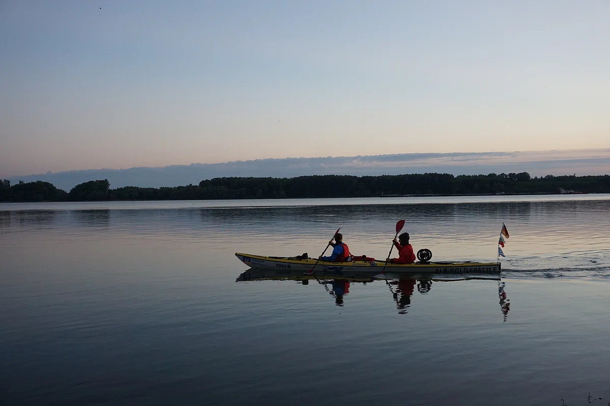 Auf der letzten großen Etappe werden wir nochmals ordentlich gefordert. Der durch Europa fegende Sturm ist auch bei uns als Gegenwind angekommen. Um den unüberwindbaren Böen etwas aus dem Weg zu gehen haben wir die Tagesetappen mehr und mehr in die windstillere Nacht verlegt. Bei den Böen unter Tags ziehen wir das Kajak zum Teil durchs Wasser watend am Ufer entlang. Bis zum Ziel sind es nun noch ca. 160 km. Voraussichtliche Ankunft wird Freitagabend oder Samstagmittag sein. Wird sind heiß auf den Endspurt!