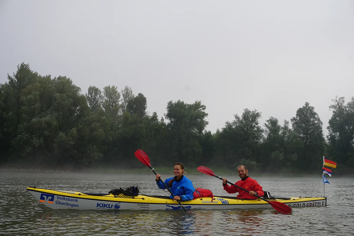 Wir konnten wie geplant heute morgen unser Kajak namens „Alb Gold Spätzle“ ins Wasser einsetzen und die erste Tagesetappe meistern. Der niedrige Wasserstand führt dazu, dass wir immer wieder neben unserem Boot hergehen müssen, anstelle zu paddeln.
