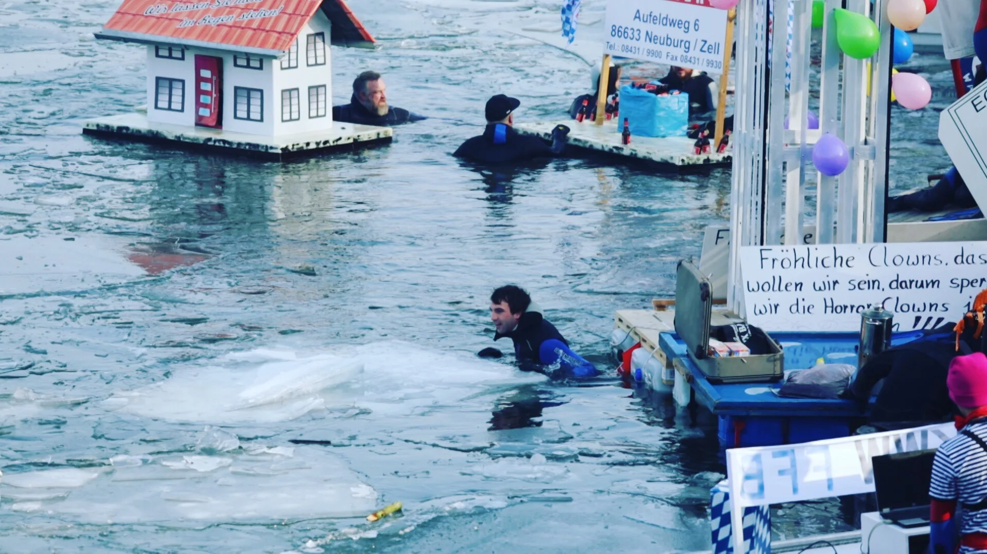 Erst als eine Eisplatte langsam an dem Donauufer vorbeitreibt, wird mir bewusst, auf was sich die Menschen hier alle eingelassen haben. Über 2200 Personen haben sich angekündigt, für das alljährliche, vier Kilometer lange Donauschwimmen in Neuburg an der Donau – im Januar. Sicher muss es im Januar sein, schließlich ist das Donauschwimmen auch ein Faschingsumzug, bei dem sich alle Teilnehmer verkleiden und irgendwelche Boote hinter sich herziehen, die aussehen wie die Karnevalswagen in Mainz, Köln und Düsseldorf.