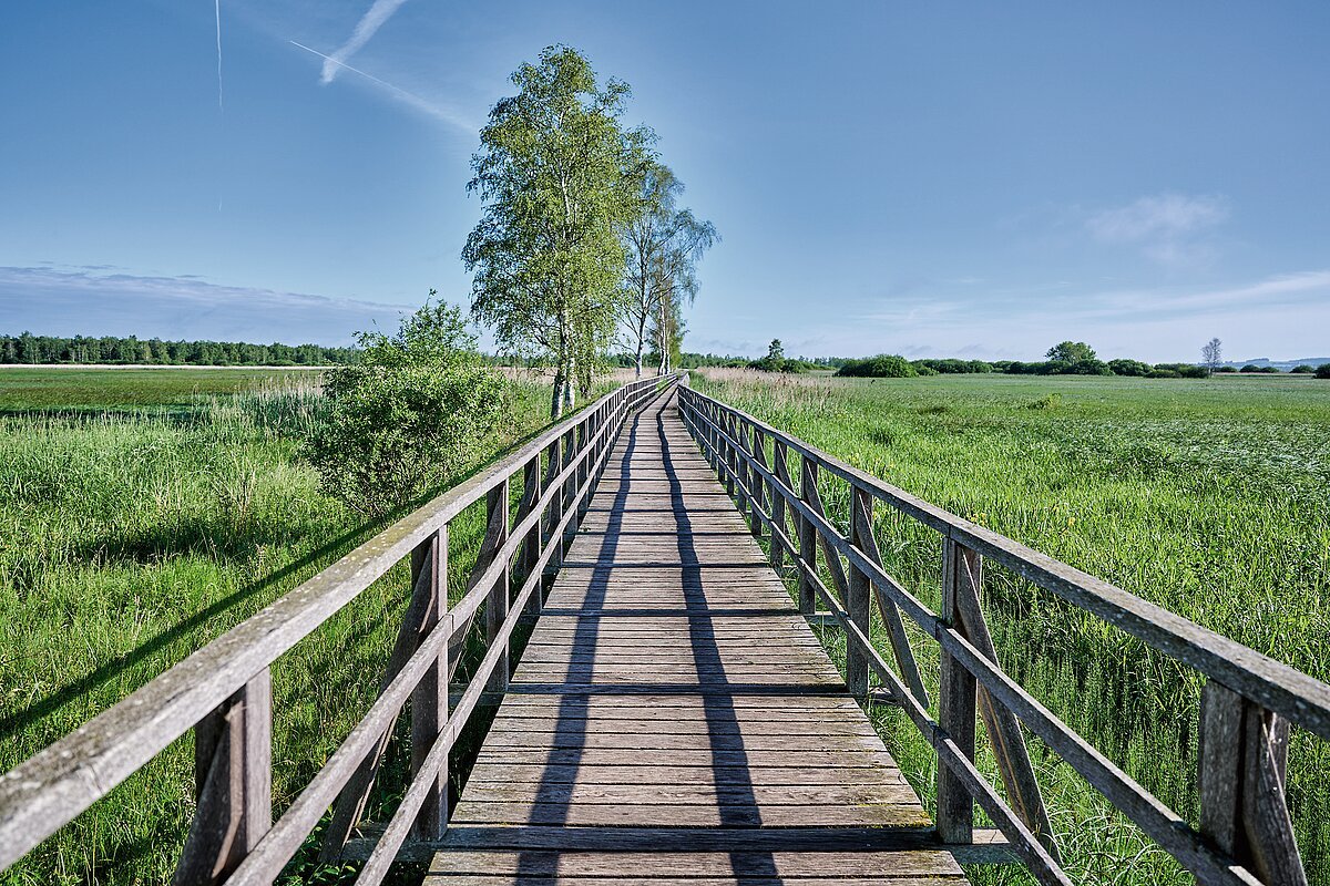 Blick auf den Federseesteg und auf das Moor. Auf der linken Seite stehen vereinzelt Bäume.