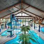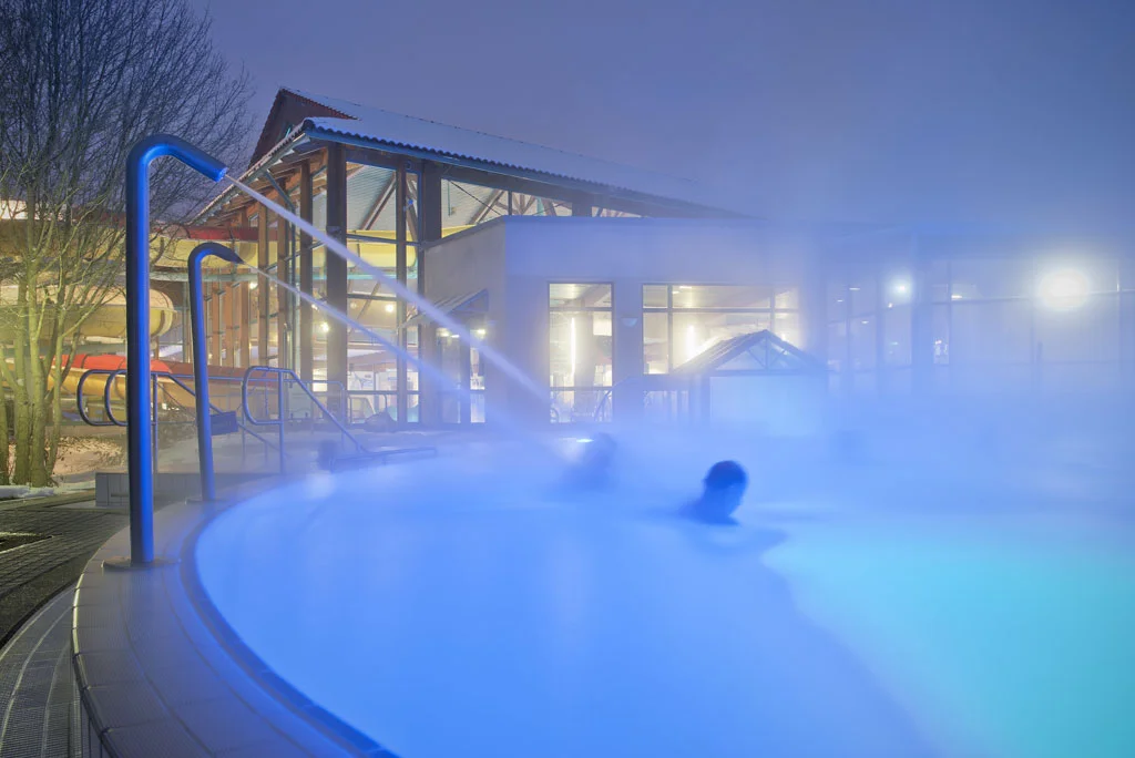 Ein Bad für Sportler, Aktive, Erholungssuchende und Familien. 650 m² Wasserfläche, Abenteuerrutsche, Saunallandschaft, Solevitalbecken und Sandstrand mit Bechvolleyball für einen entspannten Tag.