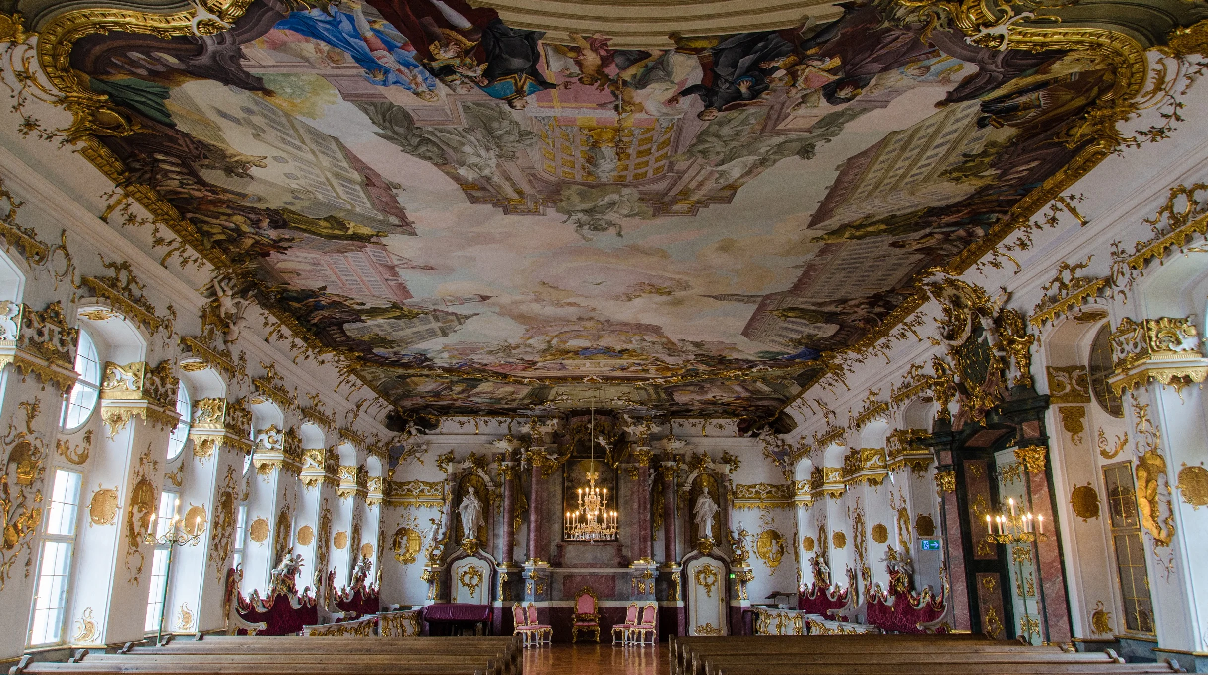 Die frühere Aula der ehemaligen Universität präsentiert sich als strahlendes Rokoko-Juwel mit prächtigem Deckenfresko, das die große Geschichte der Universität sowie der Stadt Dillingen um 1740 widerspiegelt.