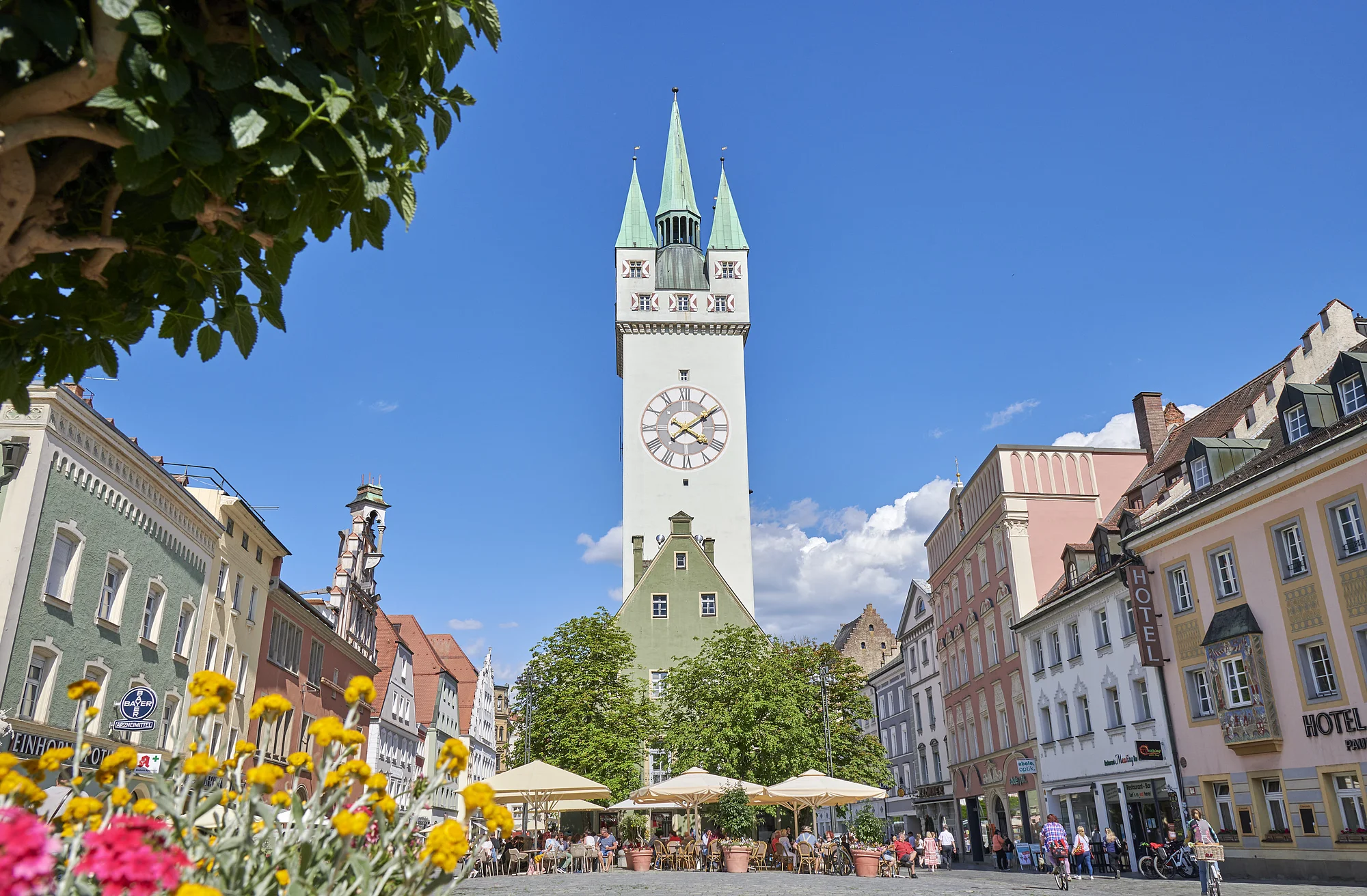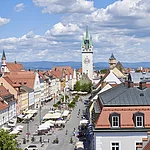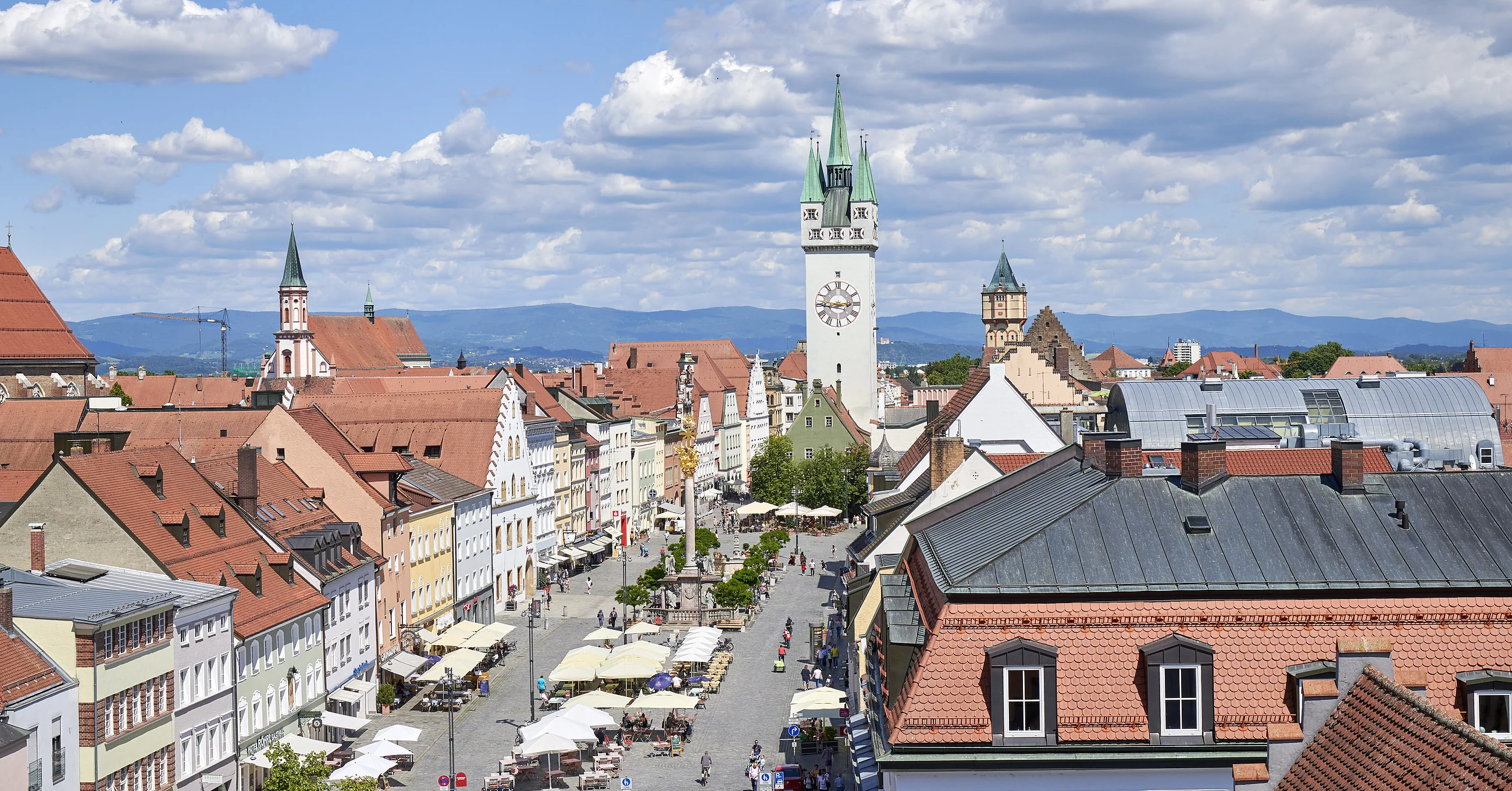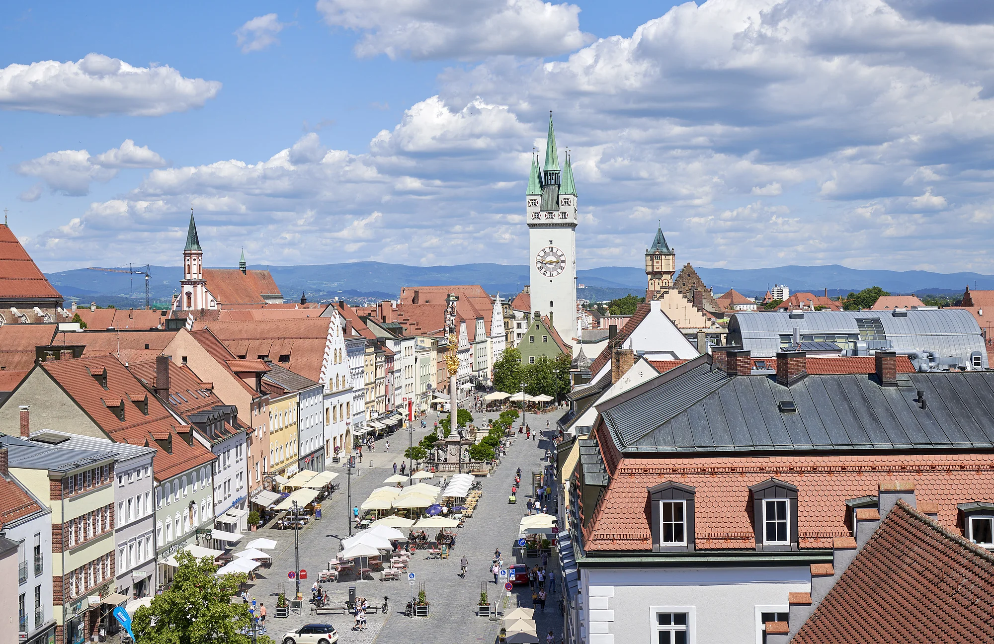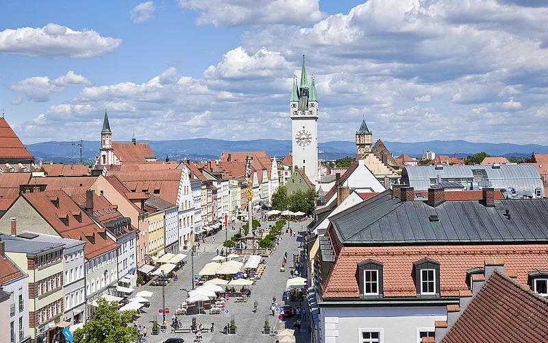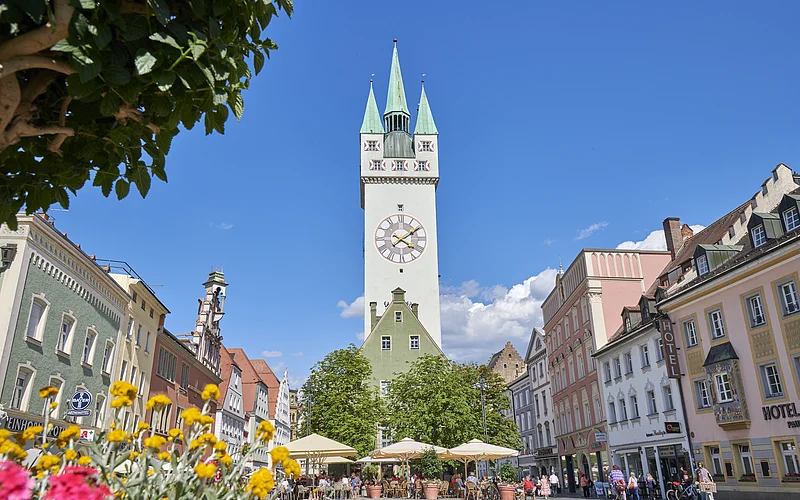 Der Stadtplatz ist ein 600m langer, mittelalterlicher Straßenmarkt, in der Mitte befindet sich das Wahrzeichen der Stadt, der Stadtturm (Baubeginn 1316). Der Stadtturm ist im Rahmen von Führungen begehbar. Von oben genießt man einen herrlichen Blick über die Stadtanlage, die Donau, den Gäuboden und den Bayerischen Wald.