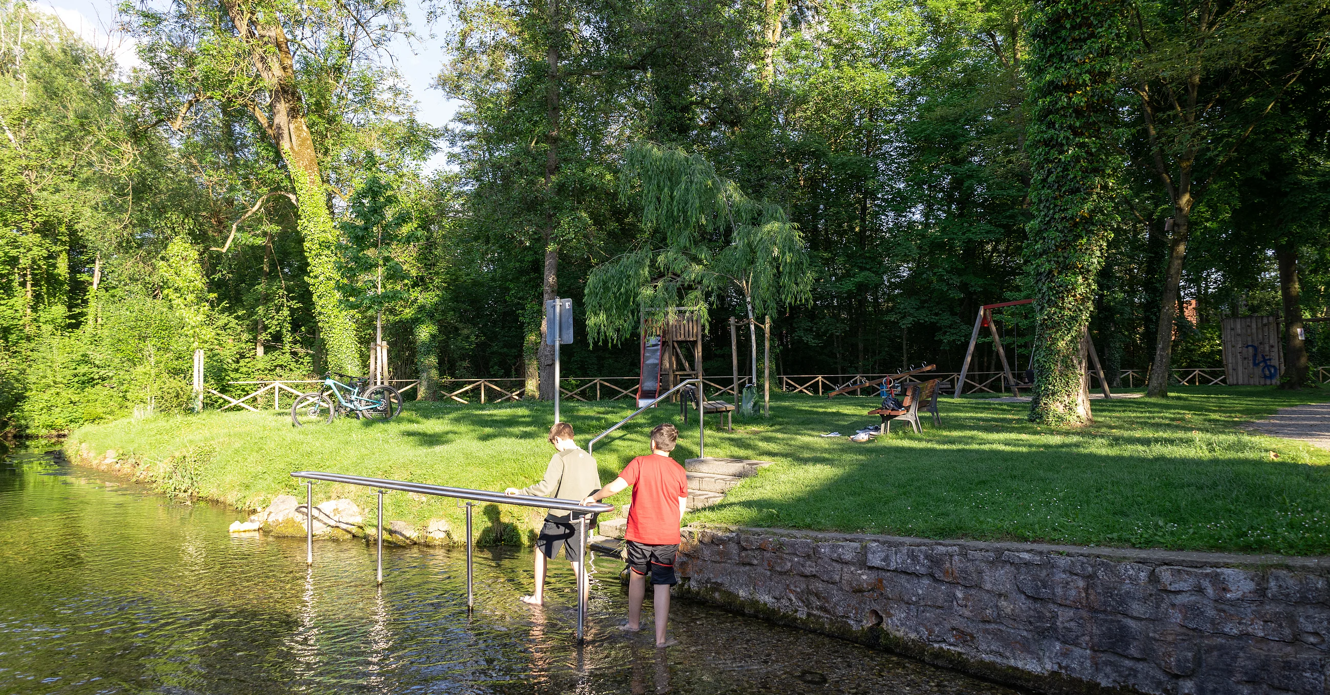 Genießen Sie im Schatten der Bäume Ausblicke auf das Wasser in der schönen Wörth. Hier finden sich ein Spielplatz und eine kleine, aber feine Mini-Kneippanlage. Gleich gegenüber der Anlage entdecken Sie ein altes Mühlrad.