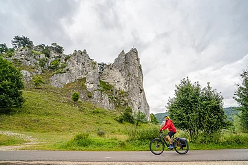 Start und Ziel ist die Wittelsbacher Stadt Kelheim mit der Befreiungshalle. Die erste Etappe führt entlang des Main-Donau-Kanals ins Altmühltal, vorbei an Essing mit der Burgruine Randeck, Burg Prunn und den Stationen des Archäologieparks Altmühltal. In der Drei-Burgen-Stadt Riedenburg gönnt man sich eine Pause mit einer Greifvogel-Flugshow auf Schloss Rosenburg. Auf einer alten Bahntrasse verlässt man das Altmühltal und durch den Hienheimer Forst geht es zurück ins Donautal. Bei Hienheim überquert man zuerst den Limes, die ehemalige Grenze des Imperium Romanum, und dann per Seilfähre die Donau. In Eining lohnt sich der Besuch des Römerkastells Abusina. Weiter geht es zum Kloster Weltenburg, idyllisch gelegen in der „Weltenburger Enge“, dem ersten Nationalen Naturmonument Bayerns. Barocke Asam-Kirche, älteste Klosterbrauerei der Welt, Klosterschenke – hier verbinden sich geistliche Einkehr und Genuss. Für die letzte Etappe nach Kelheim erklimmt man entweder auf dem Donauradweg den Weltenburger Berg oder staunt an Bord eines Ausflugsschiffes über den imposanten Donaudurchbruch.